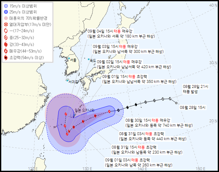 기상청 통보문에 따르면 태풍 진로는 일본 오키나와를 끼고 방향을 서쪽 - 서남쪽 - 북쪽으로 돌아서는 형태로 이동하게 됩니다. 8월 말일부터 9월 4일까지 그 주변에서 머무르게 되면서 해당 지역은 큰 피해가 예상됩니다.